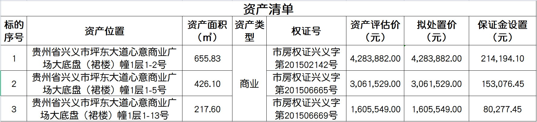 | 資產(chǎn)位置 | 1號標(biāo)的:貴州省興義市坪東大道心意商業(yè)廣場大底盤(裙樓)幢1層1-2號 2號標(biāo)的:貴州省興義市坪東大道心意商業(yè)廣場大底盤(裙樓)幢1層1-5號 3號標(biāo)的:貴州省興義市坪東大道心意商業(yè)廣場大底盤(裙樓)幢1層1-13號 | |||||||
